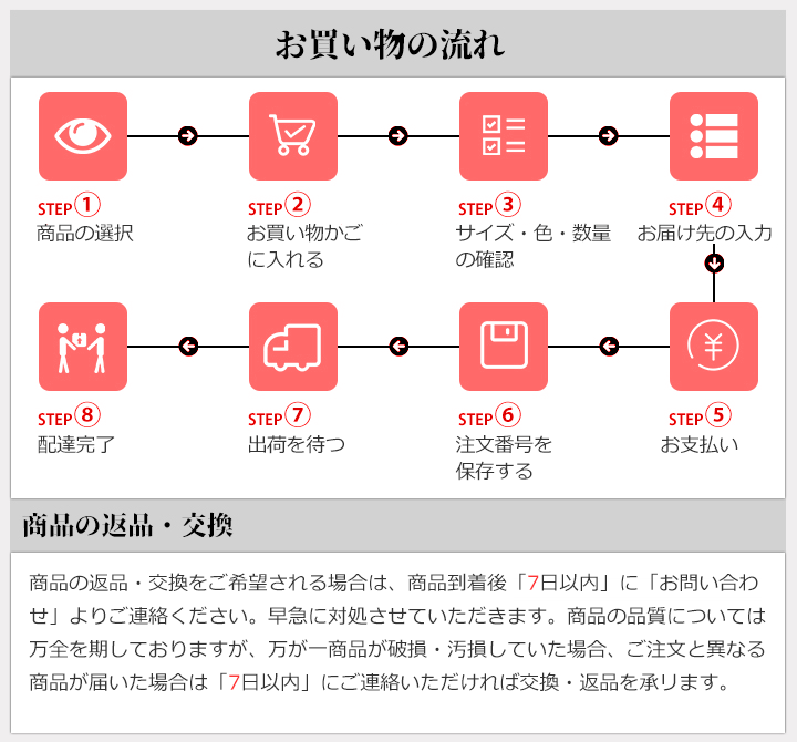 お問い合わせについて | *商品の品質には万全を期しておりますが、万一、不良・破損・汚損・誤納品などがございましたら商品到着後7日以内にご連絡下さい。早急に対応させて頂きます。 |